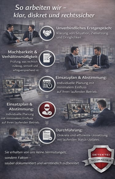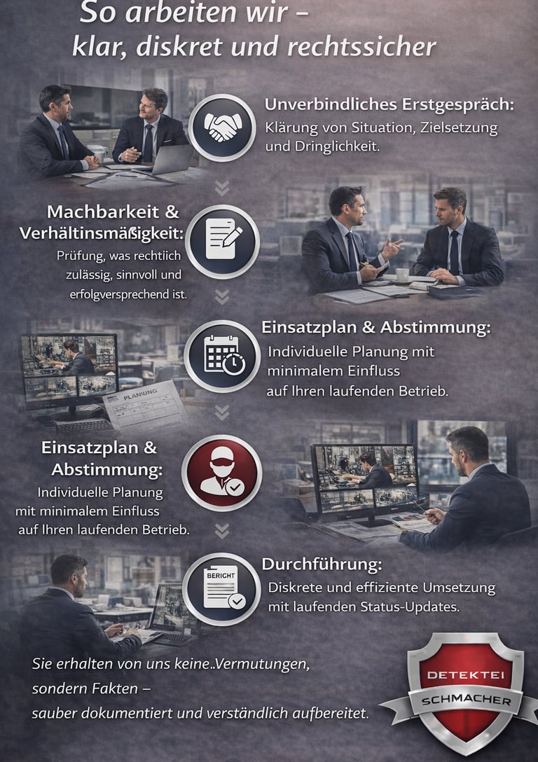 Wir sind keine „Gerüchte-Sammler“ und keine Show. Sie bekommen von uns realistische Einschätzungen, eine saubere Vorgehensweise und eine strukturierte Dokumentation, die für Geschäftsführung, HR, Compliance oder Ihre Rechtsvertretung verwendbar ist.