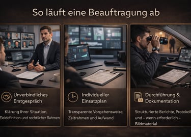 Wir unterstützen unsere Auftraggeber bei Wirtschaftsermittlungen, Mitarbeiterüberwachung, Betrugsaufklärung, Observationen sowie der diskreten Klärung privater Angelegenheiten – professionell, rechtssicher und absolut vertraulich.
